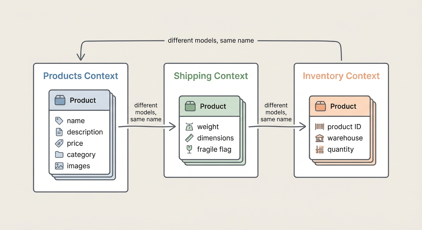 These aren't three views of the same thing. They're three different concepts that happen to share a name. DDD calls this a bounded context: a boundary within which a term has a consistent meaning.