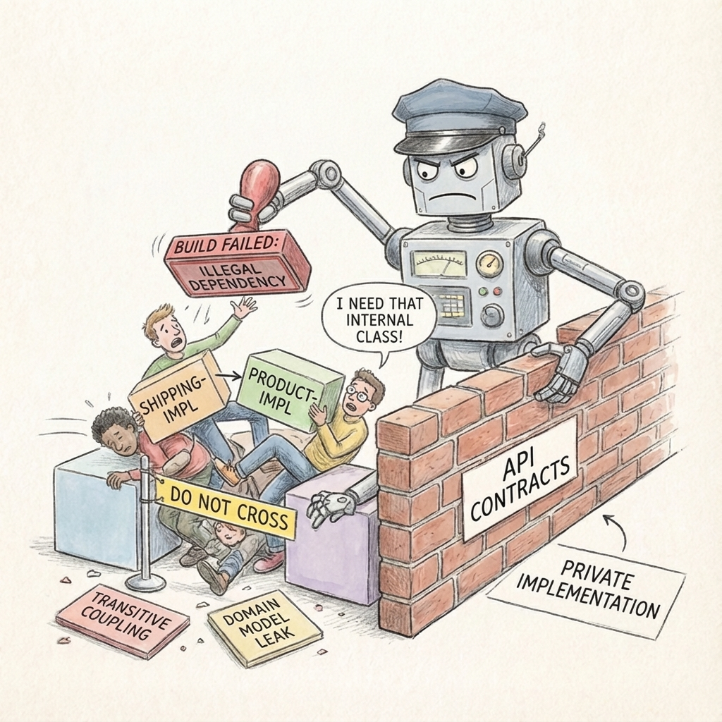 Without enforcement, boundaries erode. It happens slowly, always with good intentions. Someone imports an internal class because it's convenient. Someone adds a "temporary" dependency to meet a deadline. Six months later, your modules are coupled in ways nobody intended, and untangling them is a project of its own.