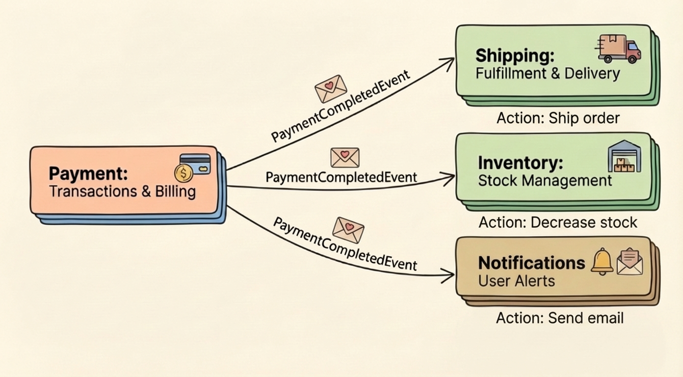This is where Domain-Driven Design becomes useful. DDD has a reputation for academic terminology and books thicker than your laptop, but the part that matters for architecture is simple: organize around business domains, not technical layers.