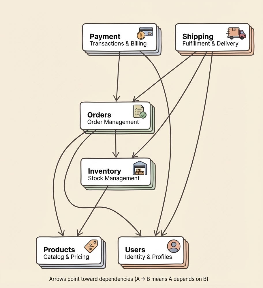 A useful test: can you describe the module in one sentence without conjunctions? "Manages the product catalog" works. "Handles payments and shipping and user profiles" is three modules wearing a trench coat.