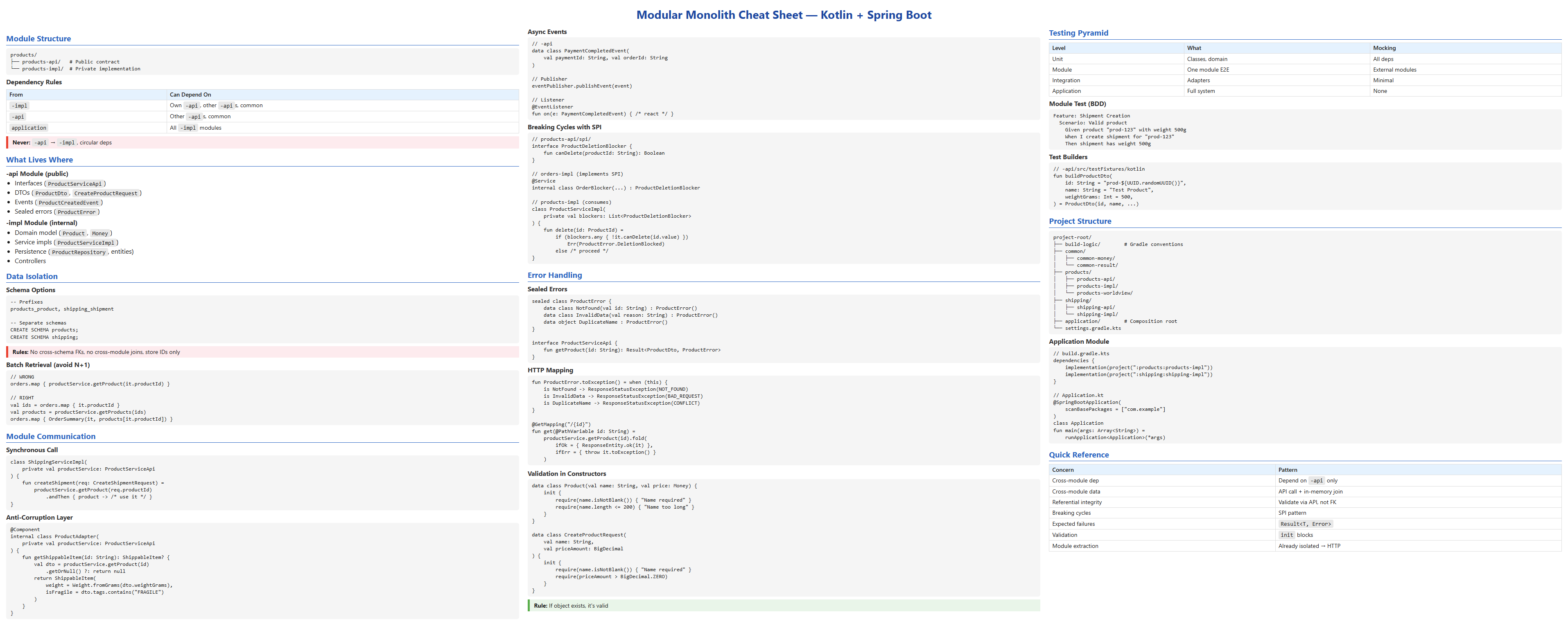 This post is a practical guide to building one in Kotlin and Spring Boot. We'll cover where to draw boundaries, how to enforce them with Gradle, how to structure code inside modules, how to isolate data, how modules communicate, error handling, and testing. The focus is on patterns that work in real codebases, not theoretical ideals.