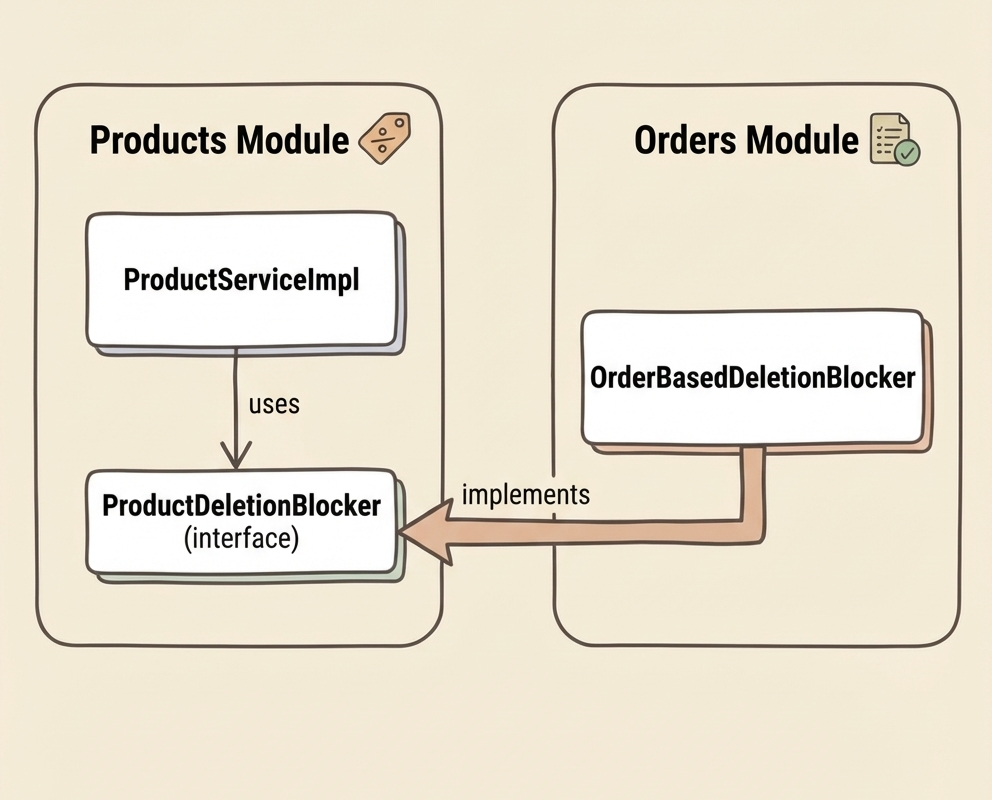 }This works, but it creates tight coupling. Shipping now depends on ProductServiceImpl—a concrete class with its own dependencies, internal structure, and implementation details. And even worse, this coupling is transitive: ProductServiceImpl depends on ProductRepository, which depends on database entities. Shipping has indirectly coupled itself to the Products database schema.