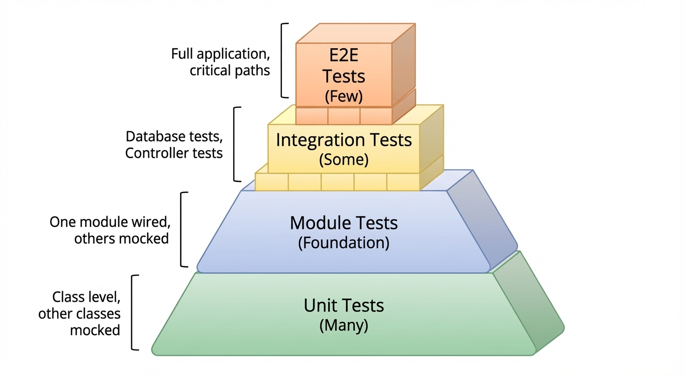 The architecture enables meaningful tests. Because modules have clean APIs, you can mock them. Because boundaries are enforced, module tests verify real units of functionality. Because data is isolated, you can test against a real database without setting up the world.